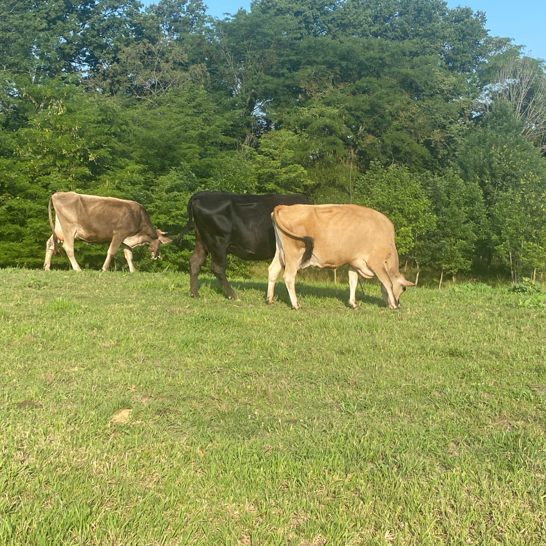 You will see a fun assortment of breeds and crosses here at Flat Branch Farm. We try to plan our breeding and calving schedule to have around 3 cows in milk at all times throughout the year. This great for our herd share members because that means there is no "off season" when all the cows are dry and milk pick-ups are paused. We also enjoy having raw milk year-round!